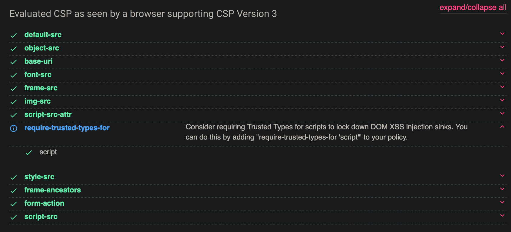 Du testar din Content Security Policy genom att använda exempelvis Googles CSP Evaluator. Försök alltid att göra din policy så strikt som möjligt. En strikt CSP ska ge följande resultat: